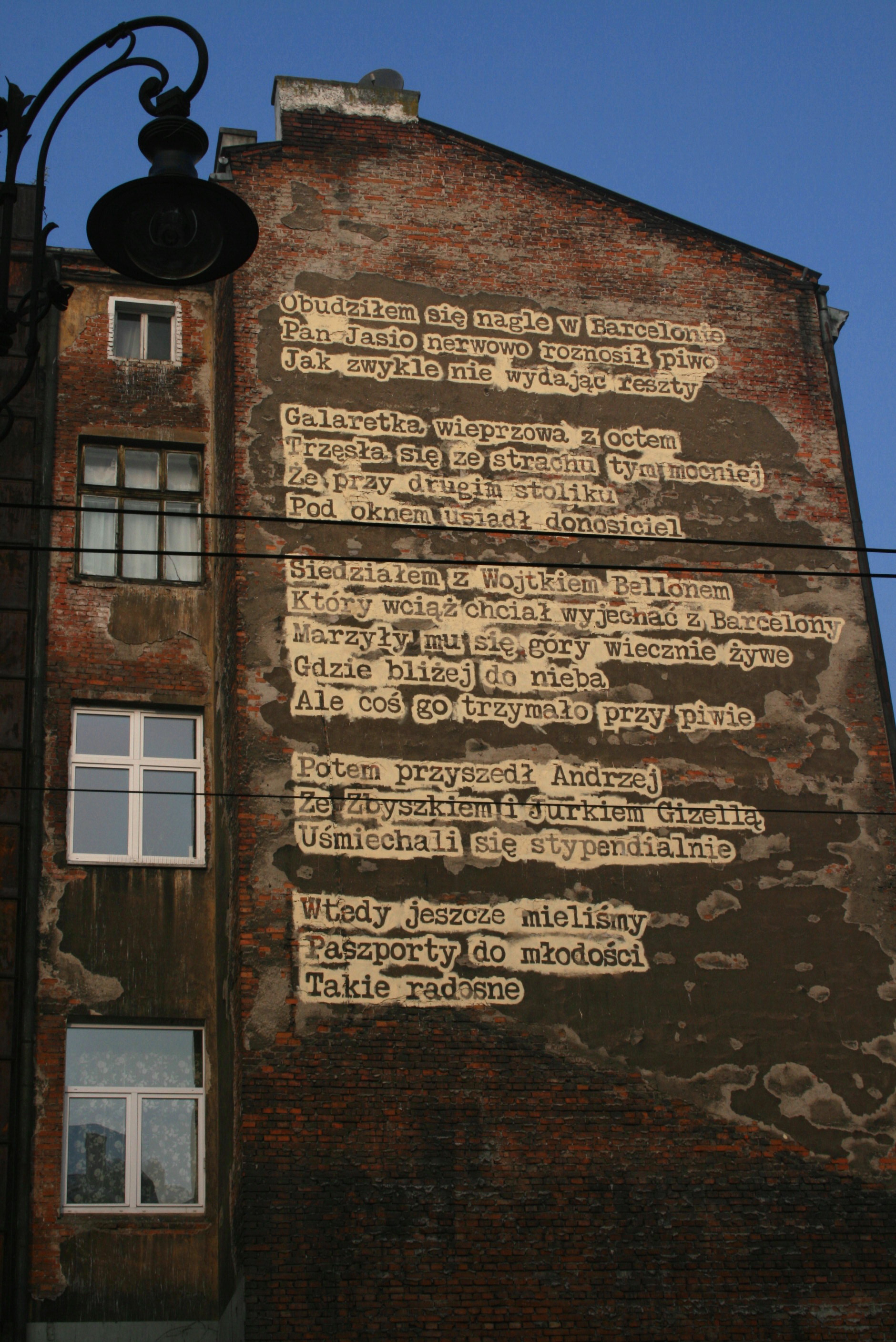 Krakow, a poem on a building, very nostalgic, speaking of the lost passports to joyful youth (via http://konteksthr.pl/adam-ziemianin-i-jego-poezja/)