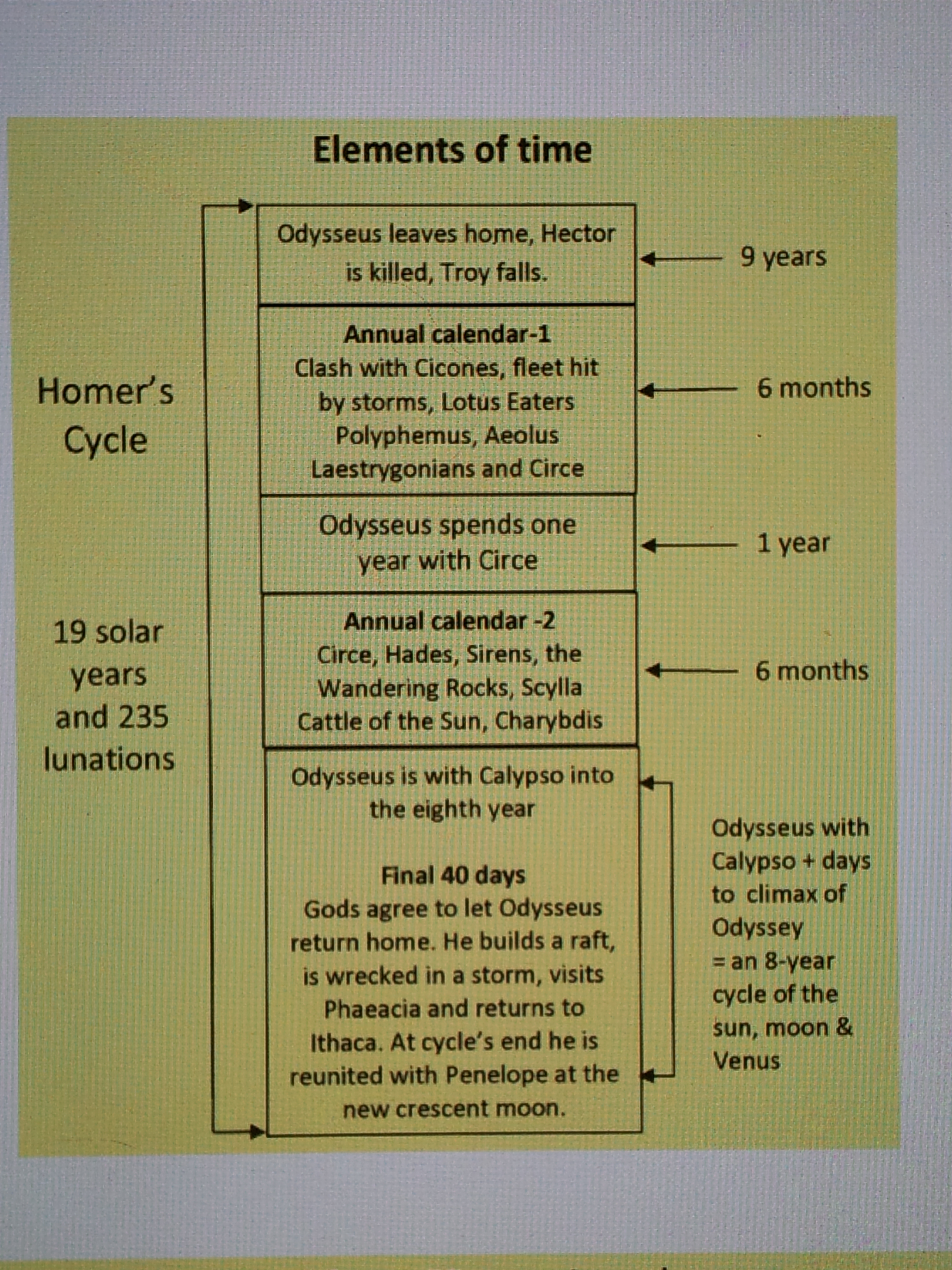 In his epic Homer linked solar with lunar time and an eight-year cycle of the sun, moon and Venus, which is presented in the following chart: