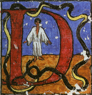 The image accompanying this chapter shows a figure clad in white confronted with a snake in the desert. This is an echo of the image from the chapter Soul and God (part 3), which depicted a white dove and a black snake. Here the body of the snake encircles the image, as the figure steps inside the ring. Confrontation with the unconscious begins.