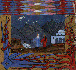 The title of Chapter IX of The Red Book (Liber Primus) is Mysterium. Encounter. This chapter contains a powerful vision, in which Jung sees the prophet Elijah with a black serpent at his feet, accompanied by who the prophet says is his daughter, Salome. She is blind, which symbolizes the wisdom of the inner vision and the blind power of instincts. The vision is illustrated by a painting, which shows the figures at night in the mountains.
