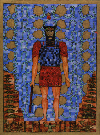 “Two bull horns rise from his great head, and a rattling suit of armor covers his chest. His black beard is ruffled and decked with exquisite stones. The giant is carrying a sparkling double axe in his hand, like those used to strike bulls. Before I can recover from my amazed fright, the giant is standing before me. I look at his face: it is faint and pale and deeply wrinkled. His almond-shaped eyes look at me astonished. Horror takes hold of me: this is Izdubar, the mighty, the bull-man. He stands and looks at me: his face speaks of consuming inner fear, and his hands and knees tremble.”