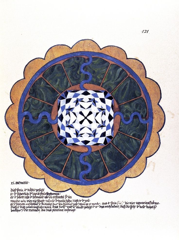 Image 121 is a beautiful mandala with the philosopher’s stone in the centre. Jung’s own note on the image says that the stone “expands into space through four distinct qualities, namely breadth, height, depth, and time. It is hence invisible and you can pass through it without noticing it. The four streams of Aquarius flow from the stone.” Liz Greene comments that