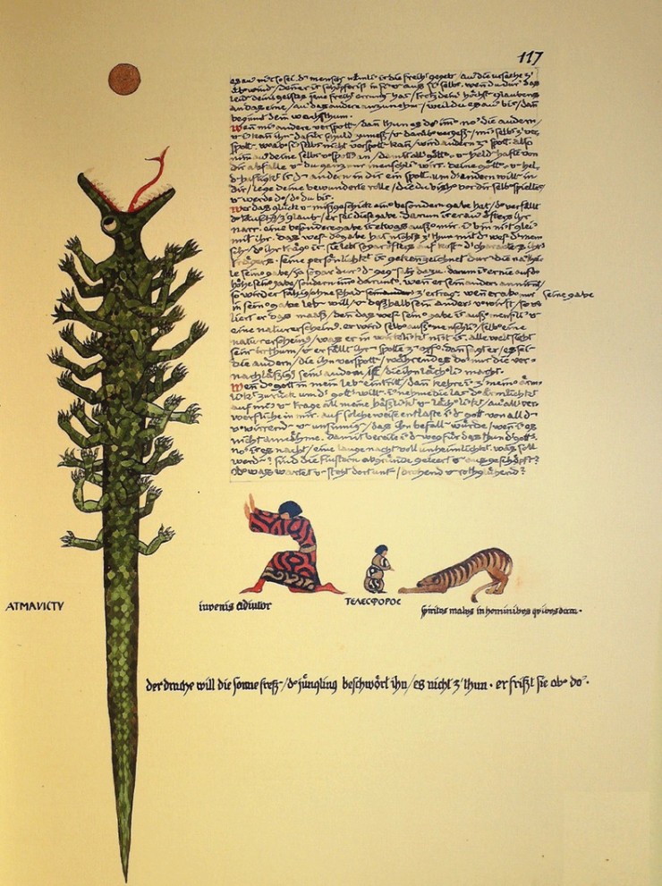 The chapter is richly illustrated with images that tell their own story. The shadow image 115 described above is followed by image 117. Here we meet Atmaviktu – the breath of life, the creative impulse. He is trying in vain to stop the dragon from swallowing the sun. In Black Book 6 (quoted in the footnotes by Shamdasani) the soul tells Jung that Atmaviktu is “a kobold, a serpent conjuror, a serpent.” From the serpent, Atmaviktu transformed into Philemon, who was a towering figure in Jung’s life and his spiritual guru. More space will be devoted to him in future instalments of the series.