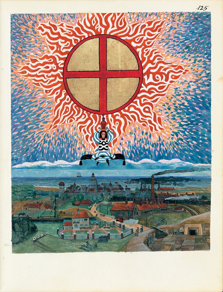 The chapter is accompanied by Image 125. In his invaluable footnotes Shamdasani explains that the scene depicted in the image resembles one of Jung’s childhood fantasies described in Memories, Dreams, Reflections. In it he imagined Basel to be a port and in his mind’s eye he saw a sailing ship on the waters of the Rhine. The image here shows Atmavictu in deep meditation (see part 30 for details about him). The Aquarian vessel on his head is being filled with divine prana or the water of the spirit, which emanates from the golden red solar mandala. It seems that the ship from the childhood fantasy sails on the border between divine and mundane reality. The orderly Swiss world below appears to be oblivious of the spiritual dimension depicted in the upper part of the image.