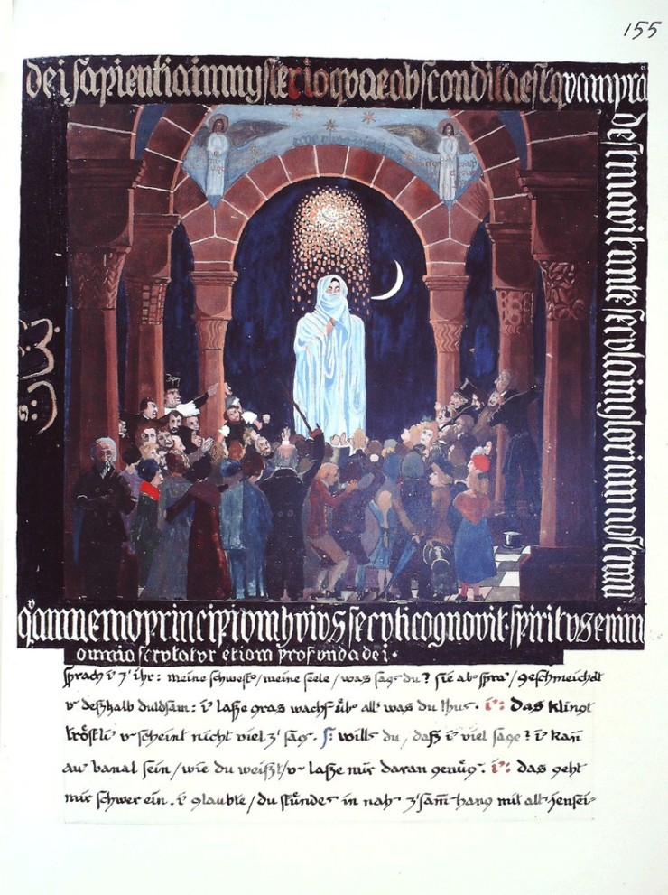 Here image 155 appears, which, as Shamdasani informs us in the footnotes, Jung mentioned in his “The psychological aspects of the Kore” (1951) without revealing himself as its author. There he said that in that image the anima was restored to the Christian church “not as an icon but as an altar itself.” In the mysterious depiction , a veiled female figure of the High Priestess is an object of worship. (2)