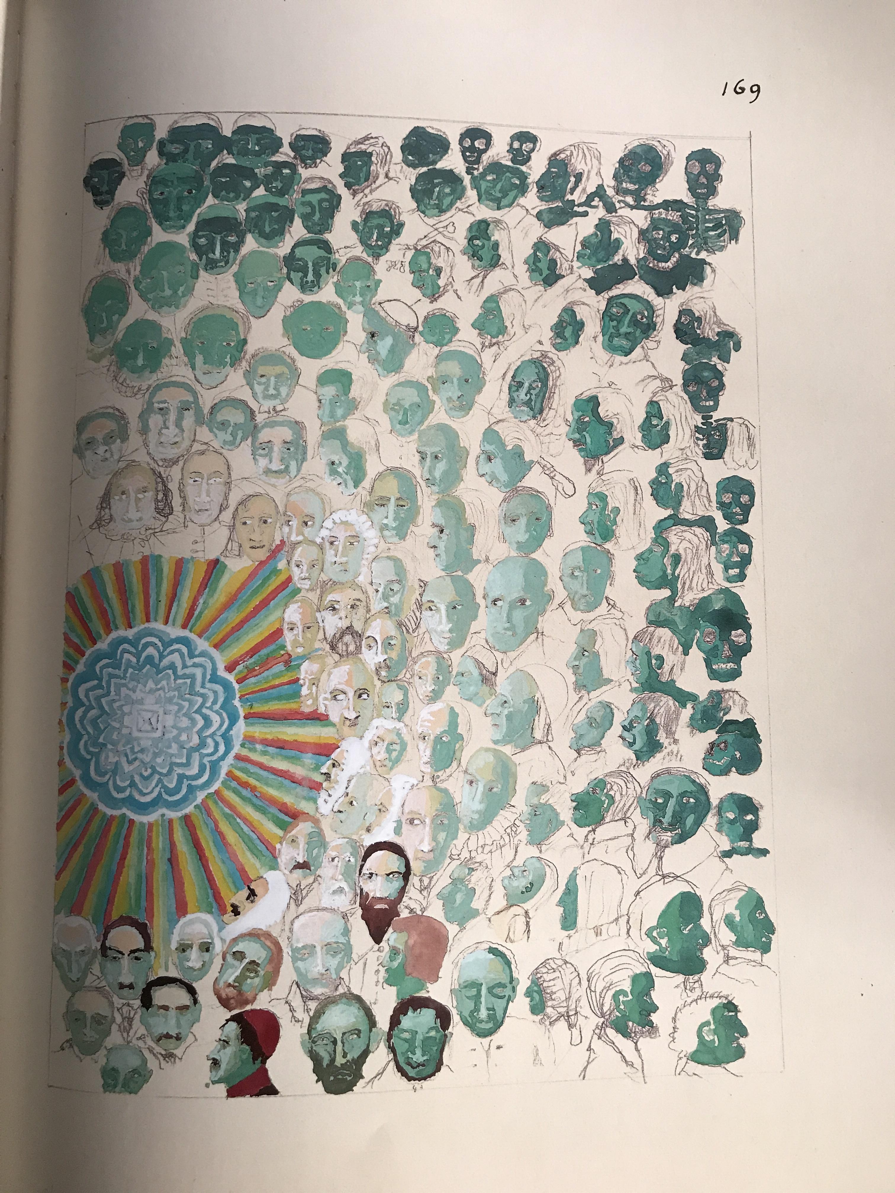 This passage is accompanied by image 169, which depicts a multitude of human faces – notably painted in green as the colour of life – of all races as well as a number of skulls in the corner. This striking image is very symbolic of Jung’s psychology, which emphasized the universal connection between the living and the dead of all races and all times. The radiant star with rainbow-coloured rays on the left-hand side may indeed stand for the single spiritual core common for all the figures depicted. Later in the chapter Jung emphasizes that he is no longer threatened by the dead since he has accepted them into his day. As Sanford L. Drob points out,