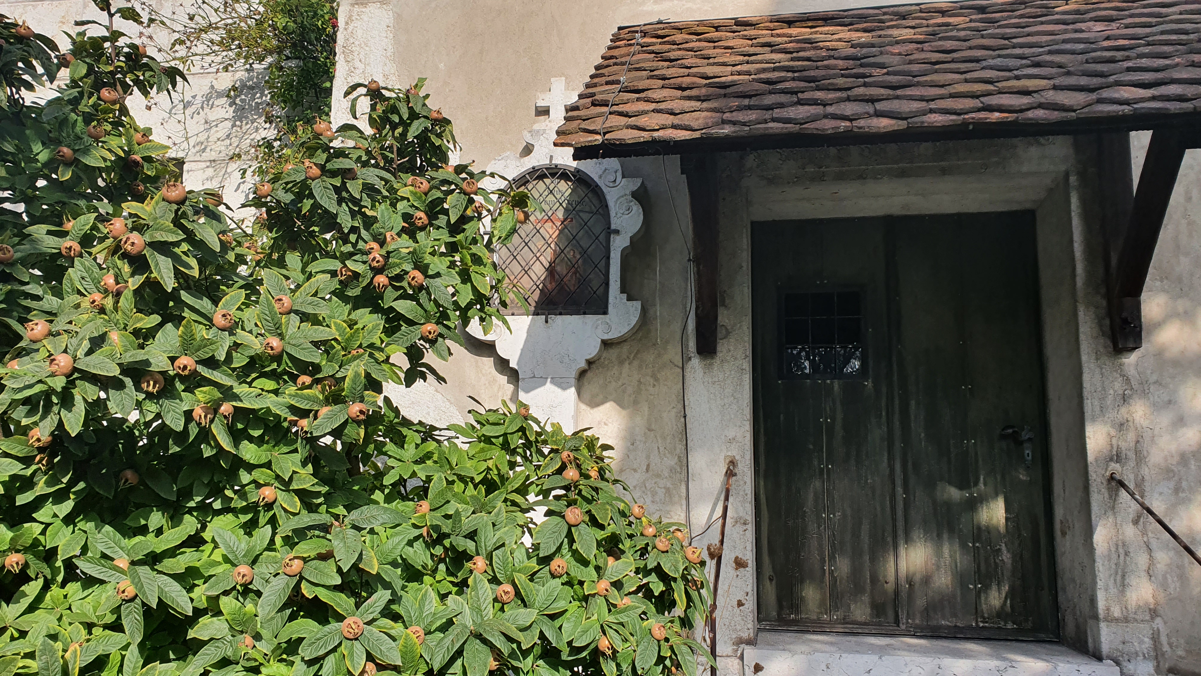 The chapel is situated outside of city walls, close to the Cloister of the Capuchins but also in an open field with a beautiful view of the surrounding cliffs and the local mountain called Weissenstein (the white stone). Approaching the chapel, one feels as if the time had stopped there. The air suddenly feels like syrup; there is an inexplicable feeling of slowness of things. When I was there the chapel and the surrounding area appeared almost deserted although the near-lying city was bustling with Saturday activity. The shrubs and plants outside the chapel oozed heaviness and a certain subterranean feel, though this might be because it was two days after the Autumn Equinox. On the left side of the door leading to the chapel grew a small tree or a shrub known as the common medlar. Along with the pomegranate, which it looks similar to, this is definitely the fruit of the underworld. Medlars are deep russet in colour and do not exactly look fresh. Fascinatingly, this particular fruit is not edible until it starts to rot, which is described by scientists as bletting, that is softening before ripening. In Coorte’s painting below the butterfly, the most common symbol of the soul, hovers over the medlar fruit, symbolizing the rebirth of the soul through putrefaction. The walls of the chapel were also covered in rosehips – the fruit of the rose. Surprisingly, medlars belong to the rose family, too.