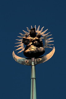 The spire visible in the first photo is crowned with the image of the Black Madonna resting on a cloud above a crescent moon and surrounded by a radiant halo of the sun. She holds the holy house in her right hand.