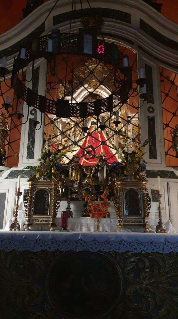 It was a sunny day but not a single ray of the sun penetrated the windowless chapel. It felt like a dark cave. There were two doors that let the light in when left open. The theme of deep blood red also continued here with reddish walls, the red robe of the Black Virgin and a bouquet of the winter cherry (Physalis alkekengi) on the altar. Later I read up on the plant in Wikipedia: “In Japan, its bright and lantern-like fruiting calyces form a traditional part of the Bon Festival as offerings intended to help guide the souls of the dead.”  We had indeed entered the cave of the goddess of the underworld. I felt torpefied, frozen, like a butterfly pinned to the wall.