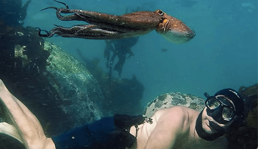 This makes the octopus an ideal canvas for psychological projection so beautifully shown in the documentary. For Craig she is both the anima and Mercurius – a psychopomp that guides him through her underworld. A broken man, as he describes himself at the beginning, he decides to look for healing in a very cold underwater kelp forest near his native Cape Town. He decides to dive without a wetsuit so that he can experience the underwater environment without any barriers. There he encounters a curious octopus that captivates him and so he decides to visit her every day for a year. What starts as a semi-scientific venture turns into an encounter with the Beloved. In his own words, he becomes “sensitized to the Other” and even suffers the feelings of “dismemberment” when she gets attacked by a shark and loses a tentacle.