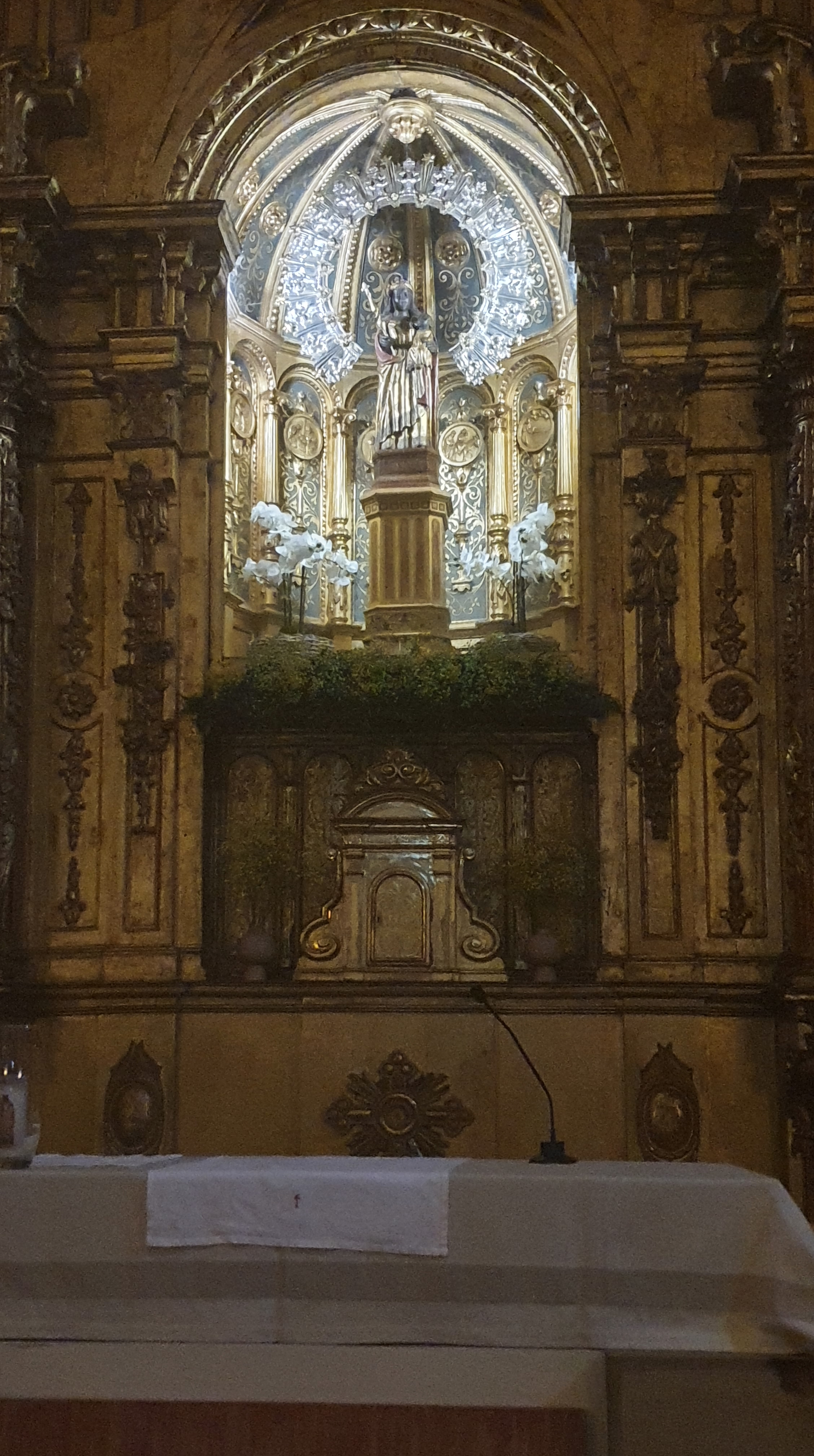 The third Black Madonna is a patroness of San Sebastian. She is to be found in Basilica of Santa Maria del Coro (St Mary of the Choir). It is a tiny figure placed in the centre of an elaborate altar. Her robes are silver. It is said that previously there was a primitive church there, dedicated to the Virgin Beltza (Black Virgin), located at the foot of Mount Urgull, which is a hill that overlooks the city.