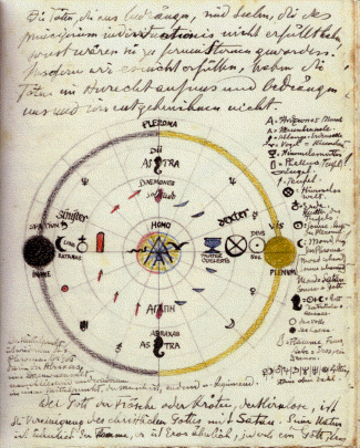 Jung painted the mandala before he wrote Scrutinies, the third part of The Red Book. He said its meaning was unknown to him at the time. Liz Greene writes that the Systema can be viewed as “a cosmological map,” which shows “the place of the human microcosm within the greater macrocosm.” (1) Abraxas is the ruler of the lower, bodily realm of incarnation while Phanes presides over the upper heavenly or spiritual realm.