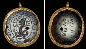 Liz Greene offers a detailed analysis of the diagram. She draws our attention to the lion-headed serpent, who is visible in both hemispheres of the painting. This is Chnoumis, often featured in ancient magical amulets, like the one below.