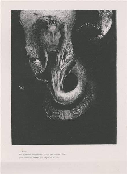 In 1913 Redon published a collection of lithographs called Origines, in which he explored the themes of creation and evolution. There he depicted “a place of chaos and indeterminacy, of murky swamplands” and “the prehistoric mire.” (4). Despite Darwin’s theory of evolution, which was put forward in Redon’s lifetime, many still believed then, as they do even now, that humans are the crown of creation, that the human shape is the crowning achievement of the evolutionary process. Redon’s vision denies this illusion: