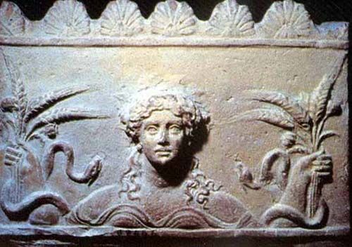 The goddess holding wheat, poppy bulbs and horned snakes
