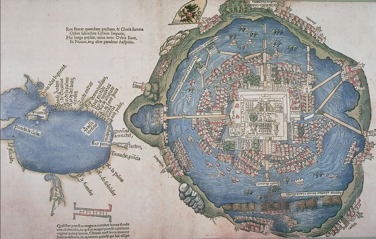 Map of Tenochtitlan – the Aztec wetland city on the grounds of which Mexico City was built, printed 1524 in Nuremberg, German; via Wikipedia